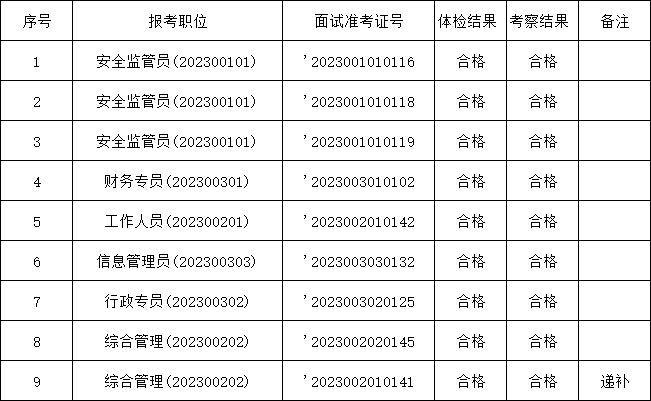 根據(jù)《關(guān)于2023年亳州魏武國(guó)有資本投資控股集團(tuán)有限公司外包崗位公開招聘》相關(guān)規(guī)定,現(xiàn)將擬入圍對(duì)象體檢、考察結(jié)果公示如下: