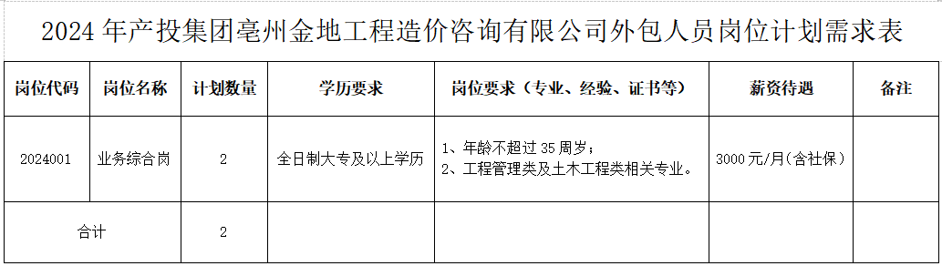 1、本次招聘崗位系產(chǎn)投集團(tuán)亳州金地工程造價(jià)咨詢有限公司外包人員,錄用后與亳州市譙騰人力資源管理有限公司簽訂勞動(dòng)合同。辦理手續(xù)后安排到相應(yīng)的崗位工作地點(diǎn)。