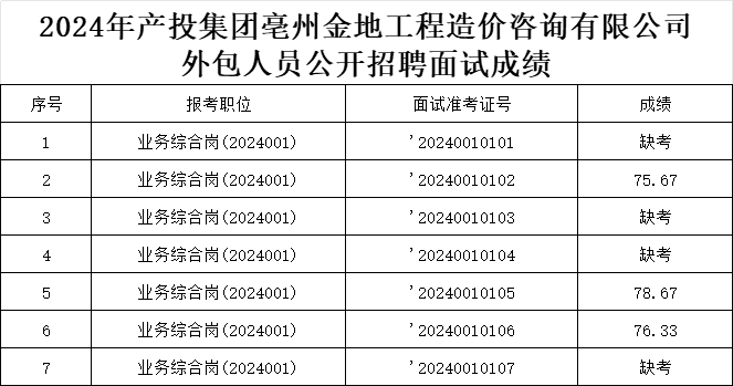 根據(jù)《2024年產(chǎn)投集團亳州金地工程造價咨詢有限公司外包人員公開招聘》有關(guān)規(guī)定,現(xiàn)將面試成績予以公示。