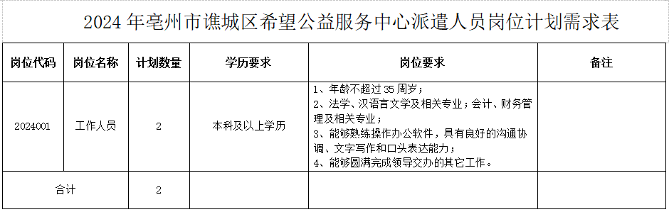 1、本次招聘崗位系亳州市譙城區(qū)希望公益服務中心勞務派遣人員,錄用后與亳州市譙騰人力資源管理有限公司簽訂勞動合同。辦理手續(xù)后安排到相應的崗位工作地點。