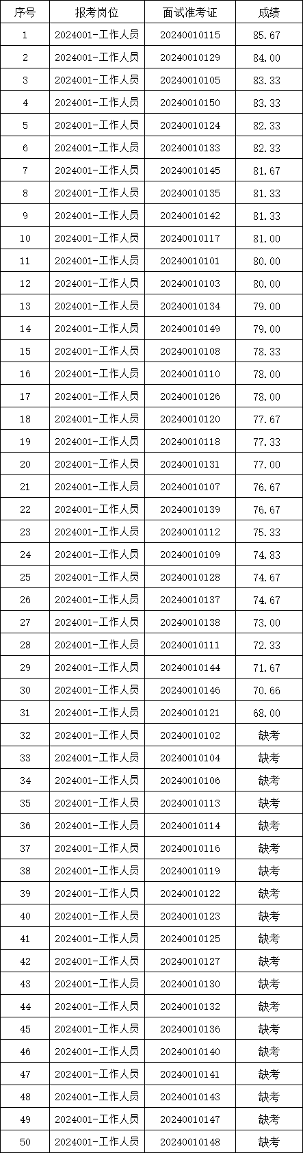 根據(jù)《2024年亳州市譙城區(qū)希望公益服務(wù)中心勞務(wù)派遣人員公開(kāi)招聘》有關(guān)規(guī)定,現(xiàn)將面試成績(jī)予以公示。