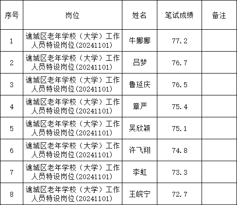 根據(jù)《2024年譙城區(qū)老年學(xué)校(大學(xué))工作人員特設(shè)崗位公開(kāi)招聘》精神,經(jīng)面試、體檢、考察等環(huán)節(jié),確定牛娜娜等8名同志符合本次招聘條件,擬錄用為2024年譙城區(qū)老年學(xué)校(大學(xué))工作人員,現(xiàn)予公示。